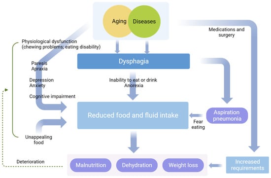 However, physiological dysfunction linked to aging is common in the aged, a group that is prone to the development of dysphagia. For instance, many older adults have a greatly reduced occlusal capacity and with increasing age, the density of oral–facial muscles in the elderly significantly decreases, which may lead to a remarkable reduction in the contraction of oral muscles during chewing and swallowing and an inability to coordinate movements well, resulting in dysphagia and related disorders [,]. Furthermore, the salivary secretion capacity decreases at older ages, affecting the flow-ability of food to form safe and easy-to-swallow boluses []. Other typical changes include a prolonged oral phase, decreased swallow volume, delayed closure of the larynx, degenerative cervical spine, reduced compensatory capacity of the brain [], and reduced dental status []. Several important risk factors associated with dysphagia in the older population are demonstrated in Figure 1B. In addition to this, the mixture of aging and related disorders, including neurological diseases [], sarcopenia [], oropharynx lesions [], and respiratory diseases [] is emerging as a significant healthcare concern, as treatments and medicines targeting such diseases could result in decreased oral ability, taste sensitivity, and xerostomia (mouth dryness), which in turn triggers swallowing difficulty and pain during feeding [].