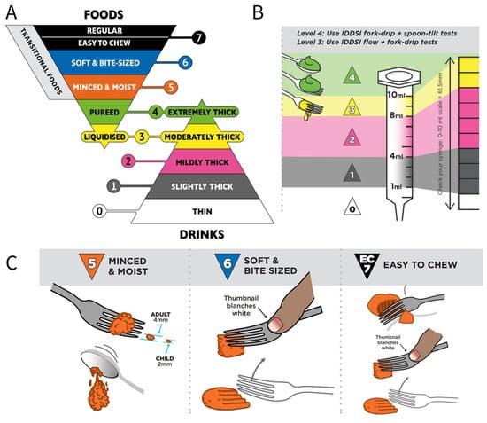 (A) The complete IDDSI framework’s detailed definitions of 2019, used for individuals with dysphagia, including texture-modified foods and thickened liquids (https://iddsi.org/Framework (accessed on 18 April 2023)). (B) Flow test for levels 0–4 with the IDDSI framework (https://iddsi.org/Testing-Methods (accessed on 18 April 2023)). (C) Food test for levels 5–7 with IDDSI framework (https://iddsi.org/Testing-Methods (accessed on 18 April 2023)).