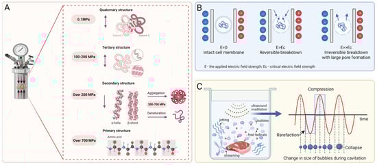 (A) Structural changes in proteins under high-pressure processing treatment. The bidirectional arrow indicates that the protein structure is reversibly changed during the process, while the unidirectional arrow indicates that the structural change is irreversible. (B) Schematic representation of the pulsed electric field mechanism. The arrow indicates reversible or irreversible perforation of the cell membrane. (C) Diagrammatic sketch of the impact of ultrasound on meat and ultrasonic cavitation effect. The red wavy line indicates a series of non-linear changes of acoustic pressure with time.