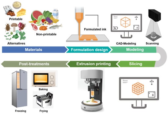 Currently, 3D printing techniques available in food production mainly include extrusion-based printing (or fused deposition modelling), selective sintering printing, binder jetting, and inkjet printing [,,,]. Among them, extrusion-based printing is the most widely used in the food sector due to the multiple choices of printed materials and simple operation of the printing system []. With this technology, a semi-solid or fluid material is extruded from the nozzle by power from a syringe, the air, or a screw, then solidified and deposited layer by layer onto the printer bed []. Figure 5 displays the pictorial flow of the 3D food printing process based on extrusion technology. Indeed, food printing starts with the pretreatment of food materials and the design of formulations, as the printing properties of ingredients need to be taken into account []. The next stage consists of creating 3D models through computer-aided design (CAD) (https://www.autodesk.com.cn/ (accessed on 4 January 2024)) or scanning an existing object. Then, the model is transferred to slicing software, where the model layers are created and parameters such as the layer height, nozzle speed, extrusion rate, and temperature are set []. After that, a G-code is sent to the printer, which then fabricates the pre-defined structure. Finally, the product is treated through freezing, baking, or frying to make it edible [,,,].