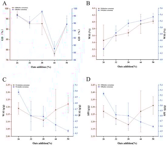 Both before and after extrusion, the gelatinization degree (GD) showed a similar trend of first decreasing and then increasing with greater oat addition (Figure 1A). But the difference in GD before extrusion was more significant, with GD being the smallest when adding 44% oats. After reaching the gelatinization temperature, IER was gelatinized, and the structure was disintegrated, and GD increased during heating [31]. The water solubility index (WSI) (Figure 1B), the water absorption index (WAI) (Figure 1C) and the swelling power index (SPI) (Figure 1D) of IER after extrusion were higher than those before extrusion. Due to the physical effects of extrusion, the starch particle structure changes, and this change made the IER have stronger water absorption and led to an increase in soluble nutrients, which was conducive to improving the nutritional value of the product [32,33]. The WSI before and after extrusion also gradually increased with oat addition, suggesting that the soluble substances in it also increased, potentially due to the high proportion of damaged starch granules in oat flour, which allowed more water into oat flour particles [34]. With an increase in the content of oat supplementation, more composites, and an increase in fiber content in the material were present, resulting in a decrease in WAI and SPI.