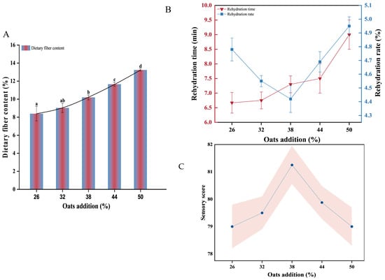 Effect of oat addition on of IER. Dietary fiber (A), rehydration time, rehydration rate (B), and sensory score (C). a–d: different lowercase letters indicated significant differences (p < 0.05).