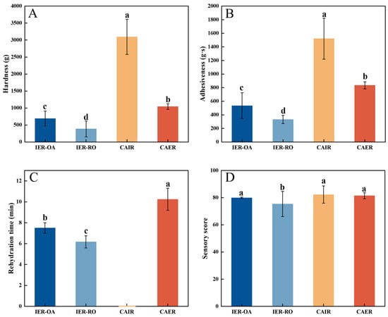 Texture, rehydration time, and sensory score of different IR. Hardness (A), adhesiveness (B), rehydration time (C) and sensory score (D). Instant-extruded rice with optimal oat addition (IER-OA), instant-extruded rice with raw oats (IER-RO), commercially available instant rice (CAIR), and commercially available extruded instant rice (CAER). a–d: different lowercase letters indicated significant differences between samples (p < 0.05).