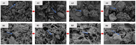 SEM results of four types of IR (Figure 4) revealed the kernel microstructure, which depended on the arrangement of molecules inside the granules. The imaging of the four samples at a magnification of 300 times (Figure 4A1–A4) showed the surface of the three IER granules was more rough and irregularly shaped, whereas the starch granules of CAIR were larger, with most of the surfaces being smoother and with better granule integrity. As the results of previous studies, under high-temperature and high-pressure conditions of extrusion, oat-broken rice starch was heated and expanded, and part of amylopectin was decomposed into small molecules such as maltodextrin and amylose, resulting in increased surface fragments and improved surface roughness of starch particles [38,39]. IER-OA had small and numerous surface fragments. Although the surface of starch granules was also relatively rough from IER-RO, the particle surface fragments were larger than those of IER-OA, and the reason for this might be related to the addition of raw oats as well as the amount of oats added to IER, which made the internal structure more loosely packed. After magnifying 5000 times (Figure 4B1–B4), CAIR had fewer internal pores and smaller pore sizes, with a dense internal structure, whereas the other three samples all had different sizes and dense pores, which indicated that the action of the extruder caused the starch to break down, which made the internal structure of the samples looser than that of the fresh rice samples. Among them, IER-RO had the largest number of pores with different pore sizes. Compared with IER-RO and CAER, IER-OA had fewer internal pores and smaller pore sizes. During the extrusion process, both carbohydrate and protein structures underwent changes, which affected the expansion and density of the extruded product [40].