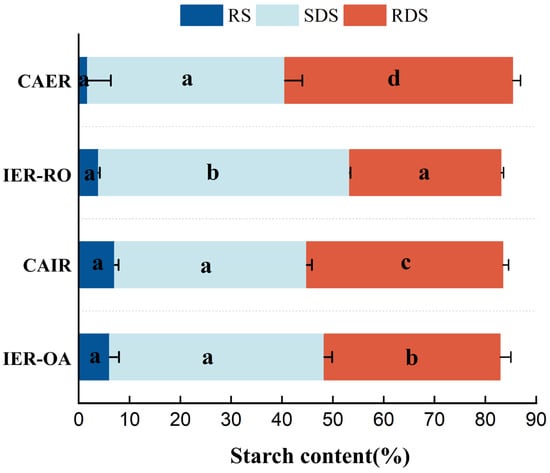 The starch digestibility properties of different IR. Rapidly digestible starch (RDS); slowly digestible starch (SDS); resistant starch (RS). Instant-extruded rice with optimal oat addition (IER-OA), instant-extruded rice with raw oats (IER-RO), commercially available oat instant rice (CAIR) and commercially available extruded instant rice (CAER). a–d: different lowercase letters indicated significant differences between samples (p < 0.05).