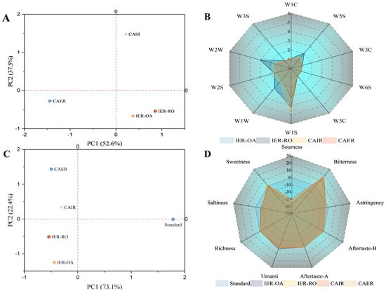Principal component analysis (PCA) was used to reduce the complexity of analyzing the similarities and differences among the data of different samples by dimensional reduction. The PCA results of the electronic nose for samples were shown in Figure 6A—the contribution rate of PC1 was 69.1%, the contribution rate of PC2 was 30.7%, and the total cumulative distinguishing contribution rate of 99.9%, which covers most of the flavor information. IER-OA and IER-RO were similar and partially overlapped, indicating similar flavor characteristics. CAIR was far away from that of the others, showing that it differed from the other samples in terms of flavor.