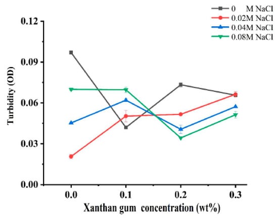 Turbidity can reflect the degree of protein aggregation as well as the droplet size of proteins, so it is widely used to characterize the sensitivity of protein-based nanoparticles to salt concentration [19]. In order to investigate the effect of ionic strength on the interaction of OVA-XG composite solutions, the turbidity was analyzed. Figure 1 illustrates the effect of different ionic strengths (0, 0.02 M, 0.04 M, and 0.08 M NaCl) on the turbidity of different OVA-XG composite solutions (XG concentrations of 0, 0.1, 0.2, and 0.3 wt%) under the condition of pH 5.5. When NaCl was not added, the turbidity of the composite solution decreased first, increased, and then decreased with the increase in XG concentration. However, in the presence of NaCl, the turbidity showed a completely opposite trend with the increase in XG concentration. At low concentrations of XG, turbidity increased with the increase in NaCl concentration, while at high concentrations of XG, turbidity decreased. It may be that when pH was 5.5, OVA molecules were negatively charged, and XG was also a negatively charged polysaccharide. The complexes of OVA and XG were mainly dominated by electrostatic repulsion.
