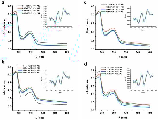 Effect of different ionic strength (0, 0.02 M, 0.04 M, 0.08 M NaCl) on the UA spectrum of different OVA-XG composite solutions. (a): different NaCl, 0 wt% XG; (b): different NaCl, 0.1 wt% XG; (c): different NaCl, 0.2 wt% XG; (d): different NaCl, 0.3 wt% XG.