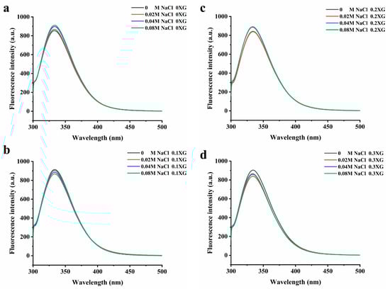 The excitation of aromatic amino acids in protein molecules changes the fluorescence intensity and maximum absorption wavelength. When the maximum absorption wavelength (λ max) of the fluorescence emission peak shifts to a longer wavelength, it indicates that the amino acid residues are red-shifted, meaning that more amino acid residues are exposed to the hydrophilic environment. Conversely, a blue shift occurs when tryptophan moves to a more hydrophobic environment [21]. Figure 3 shows the fluorescence spectra of the OVA-XG complex solutions system at different ionic strengths. From Figure 3, it can be seen that the maximum absorption wavelengths of the fluorescence emission peaks were all located between 325 and 350 nm. From Figure 3a, it can be seen that without XG, with the increase in NaCl concentration, the maximum fluorescence emission peak was red-shifted, and the fluorescence intensity increased from 853 nm to 911 nm, indicating that at pH 5.5, OVA was negatively charged and intermolecular repulsion was strengthened, the addition of NaCl caused the intermolecular structure of the protein to unfold, and tryptophan was exposed to the protein surface and moved to a more hydrophilic environment, leading to an increase in the polarity of its environment and a continuous increased in the maximum absorption peak [22]. As shown in Figure 3b–d, in the presence of XG, the maximum fluorescence absorption peaks changed with the addition of different concentrations of NaCl, and the fluorescence emission maxima were all reduced, and the λ max was blue-shifted. The λ max of the 0.1% XG-OVA, 0.2% XG-OVA, and 0.3% XG-OVA complex solution systems changed from 343 nm to 331 nm, from 341 nm to 336 nm, and from 339 nm to 337 nm, respectively. This wavelength range was a typical distribution of tryptophan residues in a relatively hydrophobic environment; that is, the addition of XG and NaCl changed the protein conformation to varying degrees, the microenvironment of amino acids changed, and tryptophan moved to a more hydrophobic environment [23]. This result corresponds to the second-order UV conduction result. Because the addition of polysaccharides increased intermolecular interactions due to the collision between protein–polysaccharide molecules, some of the tryptophan residues were wrapped within other macromolecular side chains. Secondly, after adding polysaccharides and salt, the protein structure was disrupted to some extent. This caused the hydrophobic amino acids to be exposed and gathered on the protein surface, leading to the exposure of the chromogenic group to the solvent and a subsequent reduction in fluorescence intensity [24].