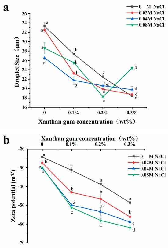 Effect of different ionic strength (0, 0.02 M, 0.04 M, 0.08 M NaCl) on the droplet sizes (a) and the zeta potential (b) of different OVA-XG complex emulsions (XG concentration of 0, 0.1, 0.2, and 0.3 wt%) under the condition of pH 5.5. Same letters indicate no significant difference, while different letters indicate a significant difference (p < 0.05).