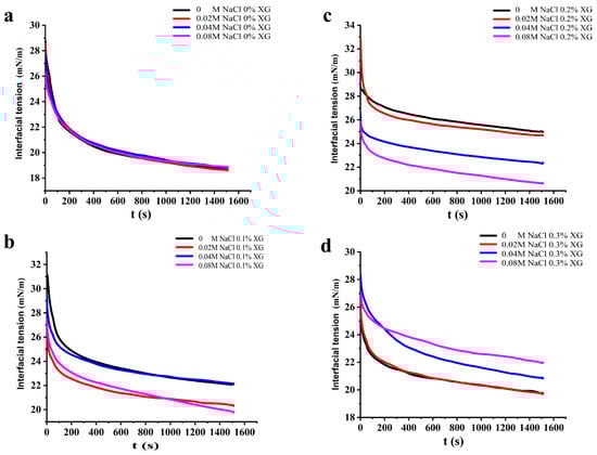 Effect of different ionic strengths (0, 0.02 M, 0.04 M, 0.08 M NaCl) on the interfacial tension of different OVA-XG complex emulsions. (a): different NaCl, 0 wt% XG; (b): different NaCl, 0.1 wt% XG; (c): different NaCl, 0.2 wt% XG; (d): different NaCl, 0.3 wt% XG.