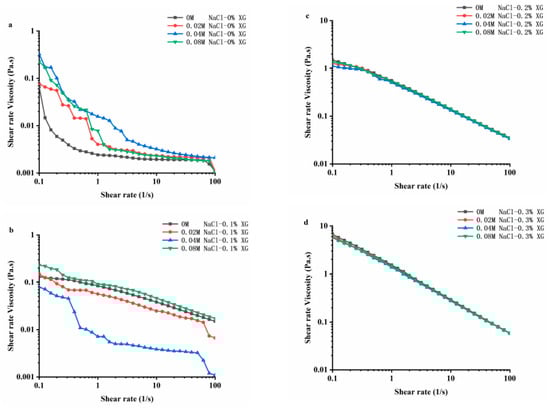 Rheology is an important physical and chemical indicator for studying the texture, taste, and structure of food products. Figure 6 shows the stable flow characteristics of the emulsions prepared using OVA-XG with varying concentrations of NaCl at pH 5.5. In the range of 0.1~100 s−1 shear rate, the apparent viscosity of all samples decreased as the shear rate increased. The composite emulsions exhibited the shear thinning behavior characteristic of pseudoplastic fluids [42]. Shear-thinning behavior is a common characteristic of emulsions, and this property may be due to the application of shear stress, which changes the size and shape of the oil droplets in the flocculated state under the shear action [43]. At a lower shear rate, the viscosity of the OVA emulsion increased after the addition of NaCl, indicating that the interaction between the emulsion particles was enhanced due to the addition of sodium ions (Na+) [22]. The Na+ shielded the negative charge on the protein surface, reducing the intermolecular electrostatic repulsion and promoting hydrophobic interactions, which led to the protein particle aggregation [22]. Also, the flocculation phenomenon between emulsion droplets led to an increase in emulsion viscosity. Interestingly, at low XG concentrations, the viscosity of OVA-0.1% XG emulsions formed with small amounts of salt ions (0.02 M, 0.04 M) showed a decreasing trend, while the viscosity of emulsions at high ion concentrations (0.08 M) increased. This indicates that the composite emulsion formed by OVA-0.1% XG had a higher degree of inter-droplet flocculation at high salt concentrations compared to a low salt concentration. As the interaction force between droplets was reduced, small amounts of salt ions caused the emulsion viscosity to decrease. However, the increase in ion concentration leaded to an increase in emulsion viscosity and the formation of a denser gel network structure [18].