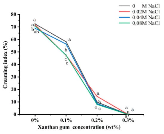 Effect of different ionic strength (0, 0.02 M, 0.04 M, 0.08 M NaCl) on the creaming index of different OVA-XG complex emulsions (XG concentration of 0, 0.1, 0.2, 0.3 wt%) under the condition of pH 5.5. Same letters indicate no significant difference, while different letters indicate a significant difference (p < 0.05).