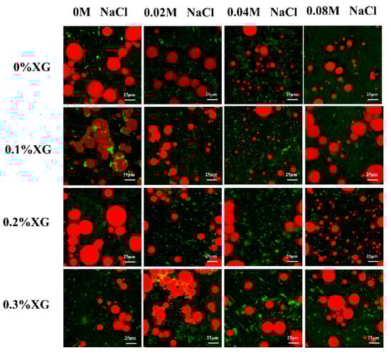 Microstructure analysis can visualize the distribution of fat globules and the droplet size of the emulsions. Figure 8 showed confocal laser scanning microscopy (CLSM) of the emulsion prepared by OVA-XG under different ionic strengths, in which the oil phase was marked in red, the protein marker in the aqueous phase was in green, and the green shiny area was the protein enriched area. As shown in Figure 8, the microstructure of the single OVA emulsion revealed large fat globules with unevenly distributed gaps between lipid droplets, preventing the formation of a dense network structure and resulting in poor emulsion stability. As the concentration of salt ions increases, the large oil droplets gradually become smaller. This is likely due to the synergistic effect of OVA and NaCl, which reduces the interfacial tension and forms an interfacial protein film around the oil droplets. Consequently, this reduces the collision between molecules at the interface [40,47]. When 0.1% and 0.2% XG were added, the droplet size of the OVA-XG composite emulsions decreased. Additionally, with the increase in NaCl addition, the emulsion generally showed a trend of decreasing oil droplets, which may be due to XG and OVA forming a denser three-dimensional network structure and a stable, protective layer at the oil–water interface or because the addition of NaCl led to an increase in the absolute value of zeta potential and the dissociation of OVA-XG aggregates [48]. However, when XG was added at 0.3%, the oil droplets gradually increased with the increase in NaCl. In addition, a significant flocculation of the emulsion droplets was observed. This phenomenon can be attributed to the high concentration of NaCl, which weakens the electrostatic repulsion between droplets by shielding a portion of the protein surface charge and promotes the collision between droplets, leading to the presence of incompletely wrapped oil droplets in the emulsion [27].