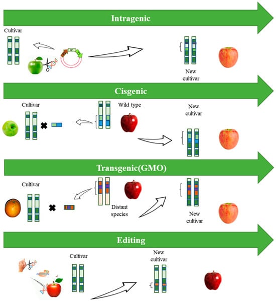 Considering this, hybridization involving wild relatives and related taxa has been increasing every day in recent fruit improvement programs. Alternative technologies, such as CIS genesis and genome editing, can facilitate the development of genetically modified crop varieties with multiple favorable traits. Through crop improvement, introducing beneficial foreign gene(s) or silencing the expression of the endogenous gene(s) in cropping plants, genetic engineering, and plant transformation have played a key role in improving crops [15].