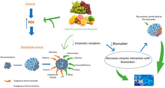 As can be seen in Figure 1, extracts of hybrid fruits rich in polyphenols come into contact and cause a reduction in cancer cells, which, in addition to natural internal factors, have gone through external factors and have their ROS production increased [61].