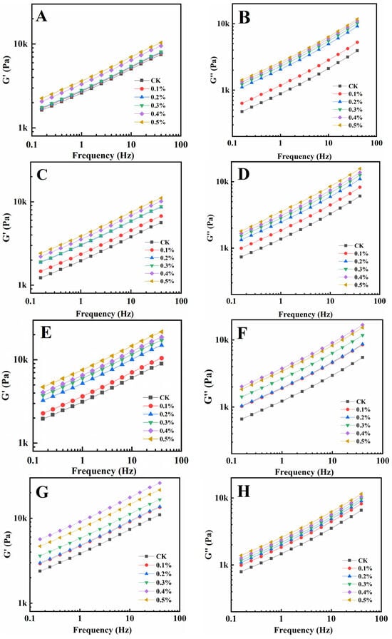 The relationship between G′ and G″ and frequency of gluten protein samples heated at 30 °C (A,B), 50 °C (C,D), 70 °C (E,F), and 90 °C (G,H) with different GSAE dosages, respectively.