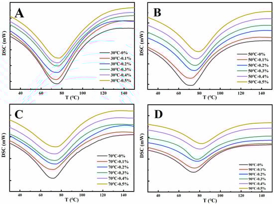 The differential scanning calorimetry curve of gluten protein treated with different levels of GSAE at the heat temperature of 30 °C (A), 50 °C (B), 70 °C (C), and 90 °C (D).