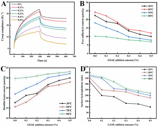 The creep and recovery curve (A), free sulfhydryl content (B), disulfide bond content (C), and surface hydrophobicity index (D) of gluten protein treated with different levels of GSAE.