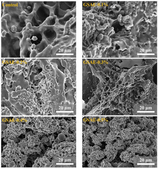 SEM images of gluten microstructure treated with different levels of GSAE.