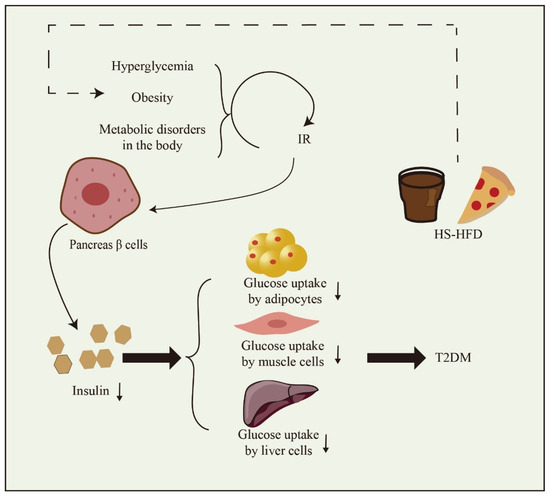 As shown in Figure 1, a diet high in both sugar and fat significantly contributes to the development of T2DM. The primary underlying causes of T2DM are IR and inadequate insulin secretion. IR denotes a diminished metabolic response in target cells, including the liver, muscle, and fat cells. Consequently, this results in the continuous overproduction of insulin by pancreatic β cells. Diminished tissue responsiveness to insulin, coupled with excessive insulin production, results in the development of hyperglycemia and hyperinsulinemia. These factors significantly contribute to the initiation of inflammation associated with T2DM [9,10]. Insulin deficiency denotes an inadequate production of insulin by the pancreas, leading to elevated blood glucose levels. The occurrence of insulin deficiency is closely linked to the apoptosis of pancreatic β cells. The escalation of β cell apoptosis is a pivotal factor in the progression of T2DM. While both IR and insulin deficiency have genetic and environmental factors at play, environmental influences exert a significant influence on the occurrence of IR and insulin deficiency, contributing significantly to their development [10,11].