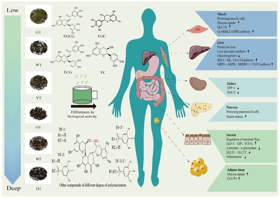Tea is one of the most popular beverages in the world. According to different processing methods, tea can be divided into six categories: green tea (non-fermented tea), white tea and yellow tea (slightly fermented tea), oolong tea (moderately fermented tea), black tea (fully fermented tea), and dark tea (post-fermented tea) [1]. The primary basis for these classifications lies in the extent of fermentation, which plays a fundamental role in comprehending the vast realm of tea. Tea has been extensively and comprehensively investigated, particularly regarding its impact on the regulation of glucose and lipid metabolism. In recent years, the field of tea and health research has placed significant emphasis on the prominent aspect of tea’s health benefits. Similarly, Kombucha tea deserves attention, particularly in blood glucose regulation. It is produced through the co-cultivation of yeast, lactic acid bacteria, and acetic acid bacteria with tea of varying fermentation levels as the raw material [2,3,4]. Due to its rich content of tea polyphenols and organic acids [3], it can effectively reduce fasting blood glucose levels [4]. Tea is abundant in essential functional components such as tea polyphenols, tea polysaccharides, and tea pigments, which have garnered considerable attention. Extensive studies have consistently demonstrated the remarkable hypoglycemic effects of these components, particularly in mitigating postprandial blood glucose levels and their potential in the prevention and treatment of type 2 diabetes mellitus (T2DM).