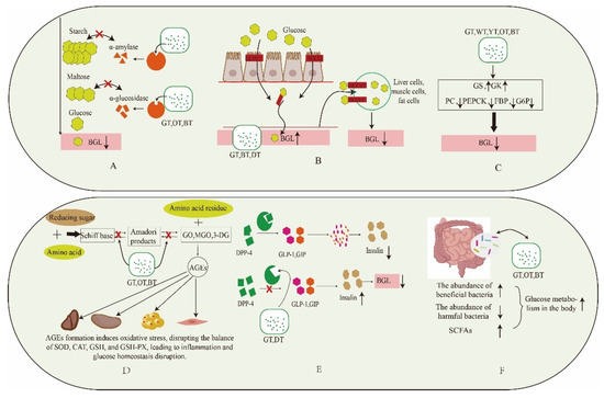 Mechanism of different fermentation degree tea in balancing postprandial blood glucose. (A): Inhibition of digestive enzymes. (B): Effect on glucose transport. (C): Inhibition of gluconeogenesis pathway. (D): Inhibition of formation of AGEs. (E): Inhibition of DPP-4 activity. (F): Regulation of gut microbiota. Blood glucose levels (BGL); glucokinase (GK); glycogen synthase kinase (GSK); pyruvate carboxylase (PC); phosphoenolpyruvate carboxy kinase (PEPCK); gructose-1,6-bisphosphatase (FBP); glucose-6-phosphatase (G6P); glyoxal (GO), methylglyoxal (MGO),3-meoxyglucosone (3-DG); superoxide dismutase (SOD); catalase (CAT); glutathione (GSH); glutathione peroxidase (GSH-PX). Downward arrow means down-regulation. Upward arrow means up-regulation.