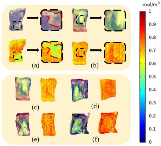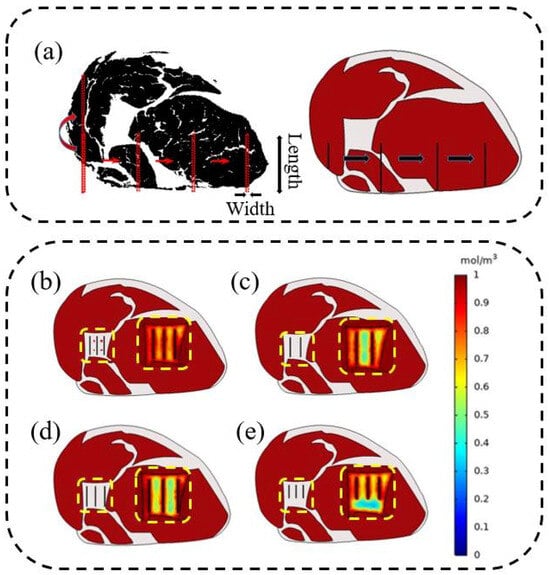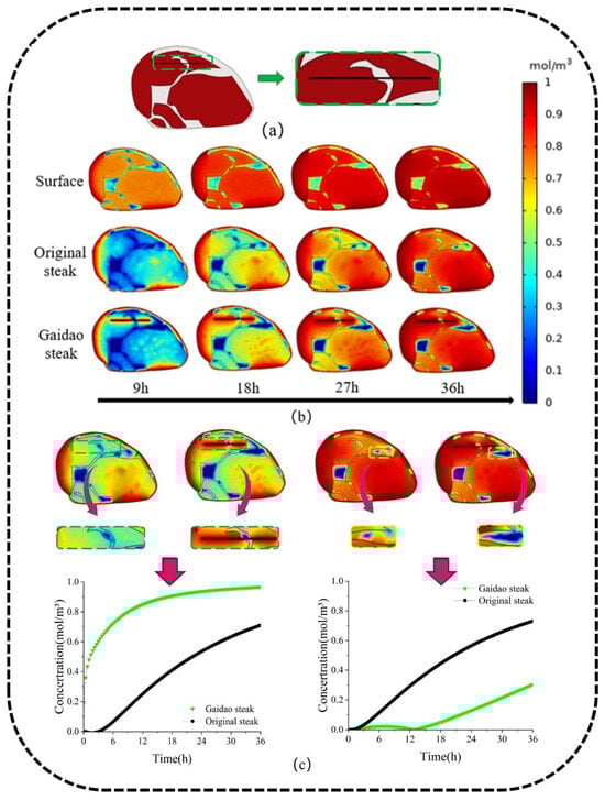 In order to highlight the effect of Gaidao technology on steak marination, this study set the simulation time period from 0 to 36 h. Firstly, a model of Gaidao steak acting on both fat and muscle tissues was established as shown in Figure 2a, from which it can be clearly seen that new inflow surfaces were set within both fat and muscle tissues, while a model of original steak was used as the control group to observe the simulation of both models over a period of 36 h marination. An interval of 9 h was used to finally result in the distribution of sucrose molecules in the internal profiles of the models as shown in Figure 2b.