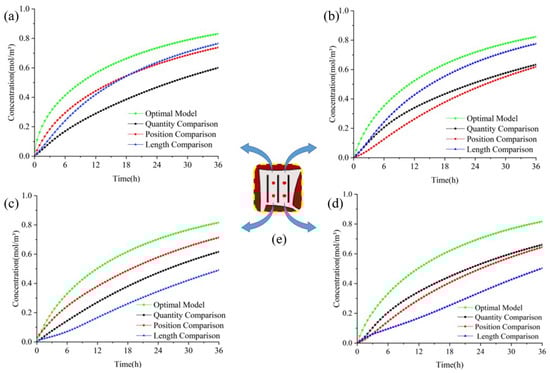 After simulation the optimal Gaidao model is shown in Figure 3b After simulation the optimal Gaidao model is shown in Figure 3b. In this model, a total of 3 cuts were made in the fat tissue, and the incision locations were evenly distributed in the fat aggregates. Three groups of Gaidao models with different parameters were also selected as control groups: a control model with the same Gaidao position and length and with twice cutting, a model with the same number of Gaidao but with larger intervals and a model with the same number and position of Gaidao but with different lengths. The four 3-dimensional cut-off points with significant variation in sucrose concentration were also selected on the same profile of the four groups of models to plot the variation in concentration from simulation 0 to 36 h to verify the marinating effect of the optimal Gaidao model.