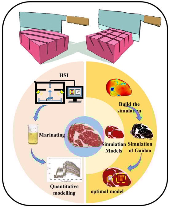 In this study, we propose to establish a 3D digital model of beef using image processing techniques and set up the model based on the physical property parameters of muscle and fat tissues, then PLS, iPLS, SiPLS and BiPLS quantitative detection models respectively for sucrose marinade in beef by HSI, in which SG-BiPLS has the best prediction effect with correlation coefficients of 0.94 for both the training and prediction sets. Subsequent parameter optimization of the Gaidao process using FEA combined with spectral image visualization demonstrated that the optimized model of Gaidao beef had a uniform distribution of sucrose and that the concentration of sucrose in both the muscle and fat fractions within the beef reached more than 80% after 36 h of marination. The method is applicable to the optimization of other Gaidao models and provides a reliable quantitative prediction and monitoring idea for Gaidao processes and multi-component meat marinating studies.