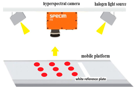 In this study, hyperspectral images of cherry tomatoes were collected using a hyperspectral imaging system. The hyperspectral camera was FX-17 (Spectral Imaging Ltd., Oulu, Finland), the spectral range was 900–1700 nm, and the number of spectral bands was 224. The spectral resolution was 8 nm. Two groups of halogen light sources were symmetrically located on both sides of the hyperspectral camera for illumination, and each group of light sources consisted of three halogen bulbs. Each halogen bulb has a power of 35 w. During image acquisition, the moving speed of the mobile platform was set to 25 mm/s, the exposure time was set to 8.26 ms, and the hyperspectral image was obtained through push-scan imaging (line scanning) from left to right, as shown in Figure 1. The cherry tomatoes were evenly placed on the platform in 3 rows and 5 columns in a single capture process. Then, a white reference plate was placed on the front end to obtain the white reference image for light intensity calibration, and a black opaque lens cover with the lamp off was used to obtain the dark reference image [21]. The corrected image could be obtained by applying Formula (1). An RGB image and the grey-scale images at 1008, 1203, and 1403 nm of one hyperspectral image are shown in Figure S1 (in the Supplementary Materials).
