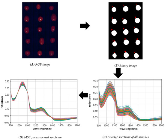 (A) RGB image; (B) the binary image of the cherry fruit region; (C) the spectra of all samples obtained by calculating the average of all the pixels within the same sample; and (D) the MSC pre-processed spectrum.