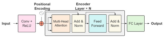 The Transformer system comprises two fundamental components—an encoder and a decoder. The Multi-Head-Attention in the encoder uses multiple heads to form multiple subspaces, which allows the model to focus on different aspects of information and learn complex understanding requirements in the context through the layer stacking of attention. In this study, only the encoder component of the Transformer was utilized to isolate the attention information, finally feeding it to the full connection layer regression output [20,26,27,28]. The Multi-Head-Attention function of the system can be defined as a process that maps a query and a set of key–value pairs to produce an output, where all components, namely the query, key, value, and output, are represented as vectors. The output is obtained by calculating a weighted sum of the provided values, where each weight is derived from the compatibility function between the query and its corresponding key. The multi-head enables the system to efficiently concentrate on diverse representation subspaces across multiple locations. The use of an attentive head can help to overcome the potential of averaging that may result in the suppression of useful information.