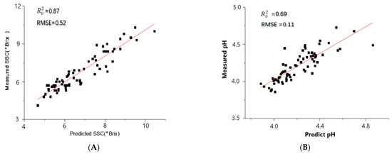 The prediction effect of the pH of all models in this experiment was worse than that of the SSC, and the same conclusion could be found in other studies. Anisur Rahman et al. developed a multivariable calibration model using hyperspectral imaging and PLSR for pH and SSC, and the predictive effect of the pH was inferior to that of the SSC, with correlation coefficients of prediction (rpred) of 0.75, 0.69, and 0.74 [14]. Yuping Huang et al. developed spatially resolved spectroscopy (SRS) to assess tomato quality. The prediction effect of the pH was lower than that of the SSC [33]. Hongbin Pu et al. employed hyperspectral imaging to forecast the sugar content and acidity of litchi. It could be found that the prediction of pH was worse than the prediction of SSC [34].