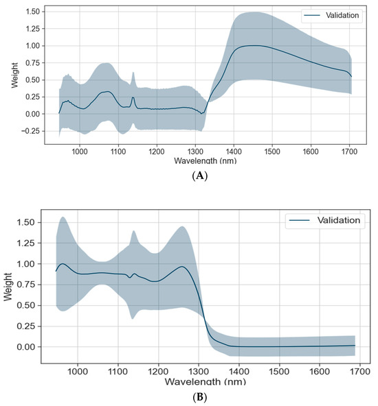 To explore interpretability, a randomly selected set of 50 samples was inputted into the pre-trained model. Grad-CAM was subsequently applied to extract gradient information from the final convolutional layer’s feature map. The resulting weight vector and the associated channel of the feature map were linearly weighted and averaged to generate a one-dimensional weight distribution map. The weights corresponding to different wavelengths are shown in the Figure 5, where the blue shadow represents the variance of the samples, and the larger the shadow area, the larger the variance, indicating the greater the dispersion from the mean value.