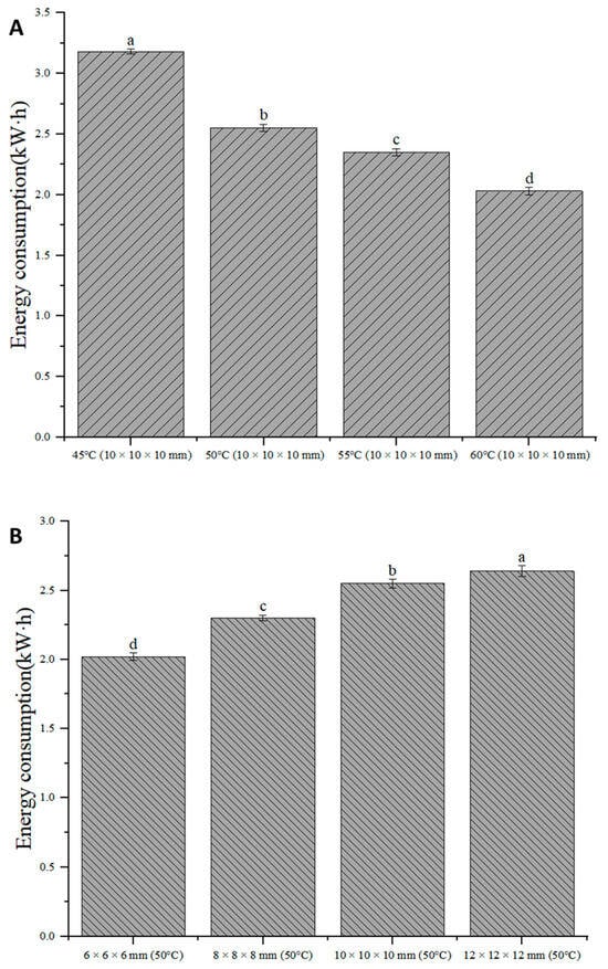 | 50 °C (10 × 10 × 10 mm) | 87.59 ± 0.03 b | 1.58 ± 0.05 ab | 8.2 ± 0.69 d | 2.83 ± 0.05 e |