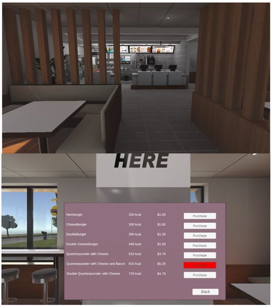 Computer simulations using 3D computer graphics to replicate food outlets are an emerging approach to studying food purchasing behavior. These simulations can be experienced using video walls [22,23], PC Monitors [24,25], immersive Virtual Reality (VR) headsets [26,27], CAVE virtual reality systems [28], or augmented reality [29,30]. These approaches can be broadly split into high-immersion virtual environments (HIVE) and low-immersion virtual environments (LIVE). The use of HIVE is particularly intriguing, as VR head-mounted displays (VR-HMD) have become relatively inexpensive and have the potential to create a sense of presence. The sense of presence causes the user to suspend disbelief and believe they are actually in the virtual environment, physically and emotionally reacting to stimuli created by the computer-generated application as if they were in the real world [31]. This may be an important benefit when studying food purchasing habits, as studies show that the environment [32,33,34,35] and emotions [36,37] can influence behavior. Consequently, food purchasing behavior in HIVE may more accurately reflect real-life behavior than simulations experienced using LIVE.