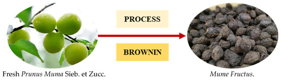 Mume Fructus (MF) is a kind of specially processed product derived from the nearly ripe fruit of the Prunus Mume (PM) Sieb. et Zucc., a plant that belongs to the Rosaceae family [1]. The PM tree is mainly cultivated in China, Japan, South Korea, North Korea, and Southeast Asian countries. The PM is known as plum, Qingmei, or sour plum in China, Japanese apricot or MF in Japan, and maesil or oumae in Korea [2,3]. The acidity of PM ranges from 4.62% to 6.78%, including citric acid, malic acid, succinic acid, and so on. It has strong antibacterial and antiseptic properties. PM also contains abundant flavonoids, polyphenols, and other bioactive substances, giving it strong antioxidant capabilities [3,4]. As a unique fresh fruit and easily accessible food ingredient, PM has diverse applications, including the production of plum juice, plum wine, preserved plums, and medicinal MF [5]. MF is commonly used as a traditional Chinese medicine with a long history, marked by its high medicinal and nutritional value. It is rich in organic acids, amino acids, polysaccharides, flavonoids, polyphenols, phytosterols, and other components. In the 2020 Chinese Pharmacopoeia, citric acid content was adopted as an important quality control parameter for MF. It has been observed to have positive effects in relieving and treating symptoms such as lung Qi deficiency, chronic cough due to Yin deficiency, prolonged diarrhea, and excessive thirst due to Yin deficiency. Modern pharmacological research has shown that MF contains multiple active ingredients with antibacterial, anti-inflammatory, anti-tumor, anti-ulcer, antiviral, antioxidant, and anti-fertility activities [1,6,7].