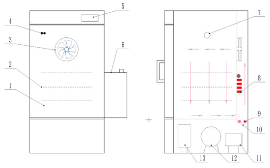 Structure diagram of hot-air drying equipment based on precise temperature and humidity control. 1. Drying chamber, 2. material rack, 3. circulating fan, 4. temperature and humidity sensor, 5. touch screen, 6. water tank, 7. test hole, 8. finned heater, 9. steam heating pipe, 10. water inlet, 11. liquid reservoir, 12. compressor, and 13. condenser.