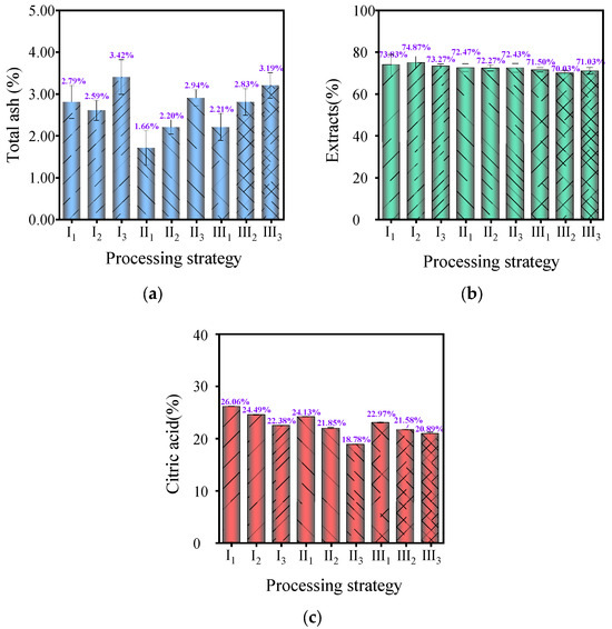 TA content, extracts, and CA are important indicators for evaluating the intrinsic quality of MF. Among them, TA content is a crucial parameter for evaluating the quality of medicinal materials. It reflects the extent of adulteration and contamination in medicinal materials and the growth quality and processing technology of MF. According to Figure 5a, the TA content of dry MF samples under different processing conditions ranged from 1.66 ± 0.41% to 3.42 ± 0.42%, all of which met the requirement in the 2020 Chinese Pharmacopoeia of not exceeding 5.0% [1]. This indicated that the PM raw materials had a good growth quality and were subjected to effective processing technologies, but there were certain differences between samples (p < 0.05). When the temperature was constant, the TA content exhibited an upward trend with an increase in humidity. This may be attributed to the reactions that occurred between moisture and inorganic salts with minerals under relatively high relative humidity conditions, which led to changes in the composition of ash [43] and increased the proportion of TA to some extent.
