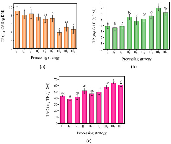 MF contains rich polyphenols and flavonoids, which offer various health benefits [5]. With the advancement of technology and medicine, people are increasingly aware of and personally experiencing the numerous health benefits associated with polyphenols and flavonoids. It is of great value to know the contents of TP and TF in MF under various processing conditions. Figure 6 illustrates the significant impact of diverse processing conditions on the content of TF, TP, and TAC in MF (p < 0.05). The TF content in the nine groups of MF samples exhibited a range between 3.87 ± 0.66 and 9.09 ± 0.81 mg CAE/g DM. The samples of process I1 (60 °C, 40% RH) had the highest TF content, while the samples of process III1 (80 °C, 40% RH) had the lowest TF content. The TF content decreased gradually with the increase in processing temperature, which may be due to the accelerated degradation rate of TF under high-temperature conditions [47,48]. The influence of relative humidity on the TF content was relatively special. Under temperature conditions of 60 °C and 70 °C, the TF content decreased first and then increased with the increase in relative humidity, and the increase amplitude was less than the decrease amplitude. However, under a temperature condition of 80 °C, this pattern changed. The TF content increased first and then decreased with the increase in relative humidity, and the maximum value was reached at 60% relative humidity.