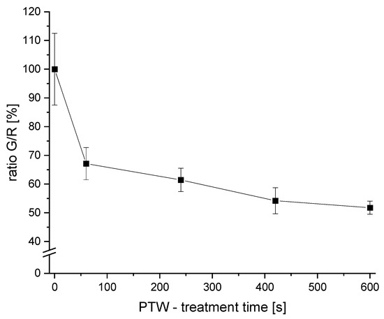 The strongest decrease in the G/R ratio compared to the control was observed after a 1 min PTW treatment (>30% reduction). With longer PTW-treatment times, the reduction efficiency continued to increase. However, the reduction with longer PTW-treatment times was not as efficient as the first interval (0–1 min).