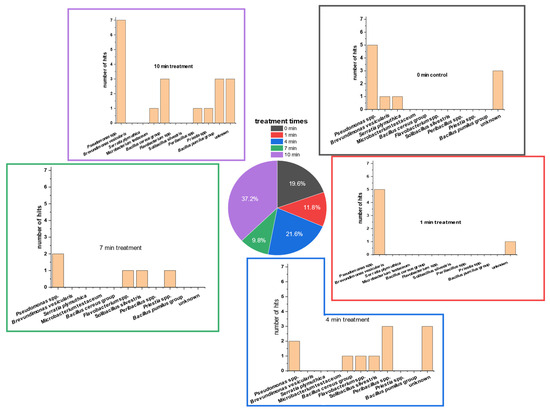 After 7 min of treatment, the microorganisms Priestia spp., Flavobacterium spp., and Solibacillus silverstris were present, in addition to Pseudomonas spp. At the longest treatment time of 10 min, the two groups of Bacillus (B. cereus group and B. pumilus group) together were the second-most-dominant bacterial genus. Less frequently represented were the microorganisms Microbacterium testaceum, Priestia spp., and Peribacillus spp.