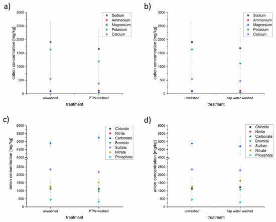 In contrast to the cation household, the influence of the PTW and tap washing showed a different influence to the anion household. In descending order of concentration, carbonate (~4900 mg/L) was the most-concentrated anion, followed by sulfate (~2300 mg/L), nitrate and bromide, at nearly the same level (~1200 mg/L), chloride (1100 mg/L), and phosphate (~450 mg/L). Nitrite was not detectable. After the PTW washing, the concentration of carbonate was up to 10% higher than before. The concentrations of sulfate (−10%) and bromide (−25%) were lower after the PTW washing. The tap water washing resulted in a lowering of carbonate, bromide, sulfate, and phosphate.