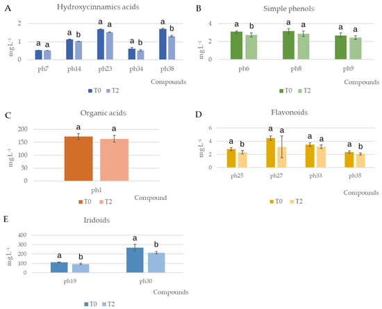 | Vanillic acid hexoside | ph5 | 2.62 | 0.16 | 2.51 | 0.14 | 1.61 | 0.06 | 1.41 | 0.04 | 1.31 | 0.12 |