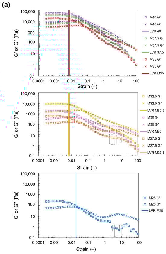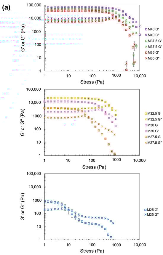 The results of the oscillation strain sweep (Figure 7a) and oscillation stress sweep (Figure 8a) showed that the values of G′ and G″ increased at high NCF contents. This indicates that a high mechanical strength was observed in samples with a high NCF content. Additionally, for all NCDs, G′ was >G″. However, with an increase in stress or strain, G′ decreased until reaching a cross-point between G′ and G″ for all NCDs. Because G′ represents the solid-like behavior, and G″ represents the fluid-like behavior of materials, a cross-point between these two values indicates that the fluid-like behavior becomes dominant. The cross-point between G′ and G″ in the oscillation stress sweep represents the yield stress of NCDs [30]. The results showed that the yield stress increased with a high content of NCF (Figure 8b) from 9.4 Pa in M25 (25 wt% of NCF) to 3220.0 Pa in M40 (40 wt% of NCF). An analysis of the time dependence of G′ and G″ is presented in the Supplementary Materials.