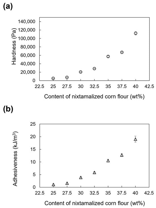 Effect of NCF content on (a) hardness; (b) adhesiveness; (c) cohesiveness; and (d) Young’s modulus of the nixtamalized corn dough (plots and error bars show the mean and standard deviation of 10 repeated measurements, respectively).