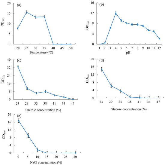 Biological characteristics of W. anomalus YT312. (a) growth temperature, (b) pH, (c) sucrose tolerance, (d) glucose tolerance, and (e) sodium chloride tolerance.