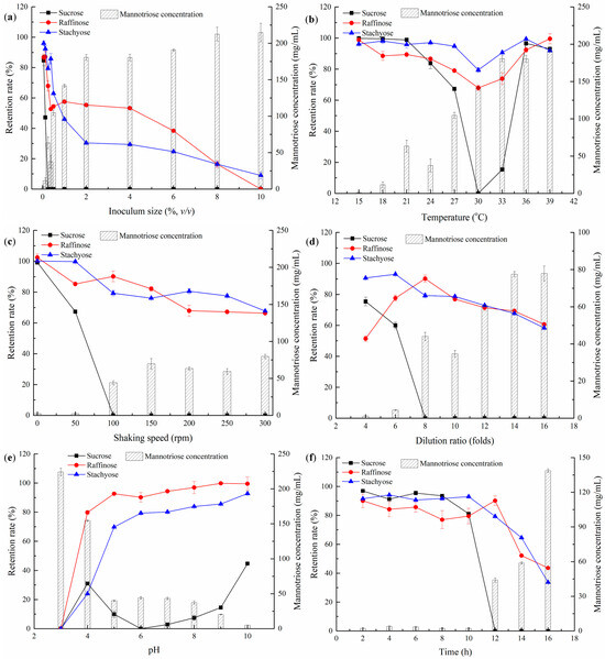 Yeasts are facultative anaerobic microorganisms that thrive under aerobic conditions. In the flask incubation method, shaking speed affected the oxygen content in the fermentation medium, thereby influencing yeast growth. Additionally, shaking speed generated shear force, which caused damage to yeast cells [49]. Higher shaking speeds were beneficial for increasing the oxygen content in the medium, but they also increased shear force, necessitating the optimization of the shaking speed. As shown in Figure 4c, after 12 h of static fermentation, there were no changes in the content of sucrose, raffinose, and stachyose in soy molasses, and only a small amount of manninotriose was detected. This was mainly because W. anomalus YT312 grew slowly and had a low cell density under static fermentation conditions, as confirmed by the growth curve results. With increasing shaking speed, the content of the three sugars decreased. The rate of sucrose reduction was higher than that of stachyose and raffinose. When the shaking speed was higher than 100 rpm, the sucrose in soy molasses was completely consumed by W. anomalus YT312, and the content of stachyose and raffinose was slightly decreased but still relatively high. Additionally, there was a significant increase in manninotriose content. Considering the retention rates of sucrose, stachyose, and raffinose, as well as the manninotriose content, the optimal shaking speed was 100 rpm, which is similar to the shaking speed used in the study by Liu et al. [35]. At this speed, the retention rate of sucrose was 0.0%, while the retention rates of stachyose and raffinose were as high as 79.3% and 90.2%, respectively. And the manninotriose content was 44.1 mg/mL.