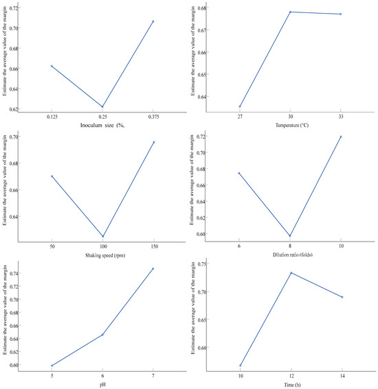 Based on the single-factor experiments, the relative optimal levels of inoculum size (A), temperature (B), shaking speed (C), dilution ratio (D), pH (E), and time (F) were used to design an orthogonal experiment. Each factor was set at 3 levels (1, 2, and 3), and an L18 (3)7 orthogonal experimental design was selected. The combinations of orthogonal experimental groups are shown in Table 2.
